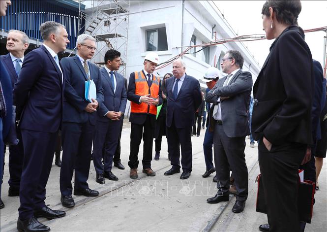 Chủ tịch Thượng viện Cộng hòa Pháp Gérard Larcher thăm khu Trung tâm điều khiển và bảo dưỡng, sửa chữa tàu của tuyến đường sắt đô thị số 3. Ảnh: Phạm Kiên/TTXVN