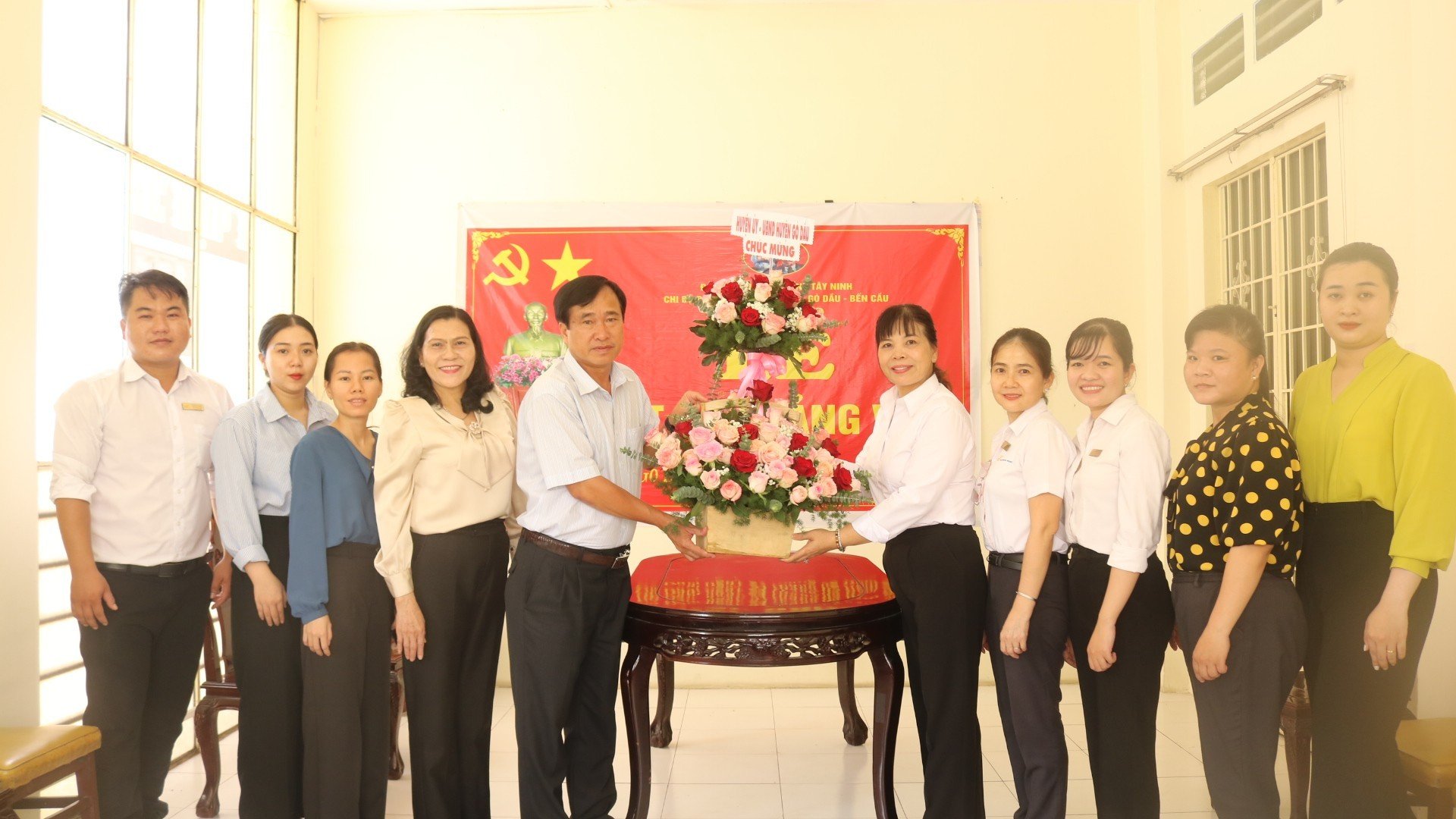 Ông Nguyễn Văn Nhu- Chủ tịch UBND huyện tặng hoa chúc mừng Bưu điện huyện Gò Dầu.