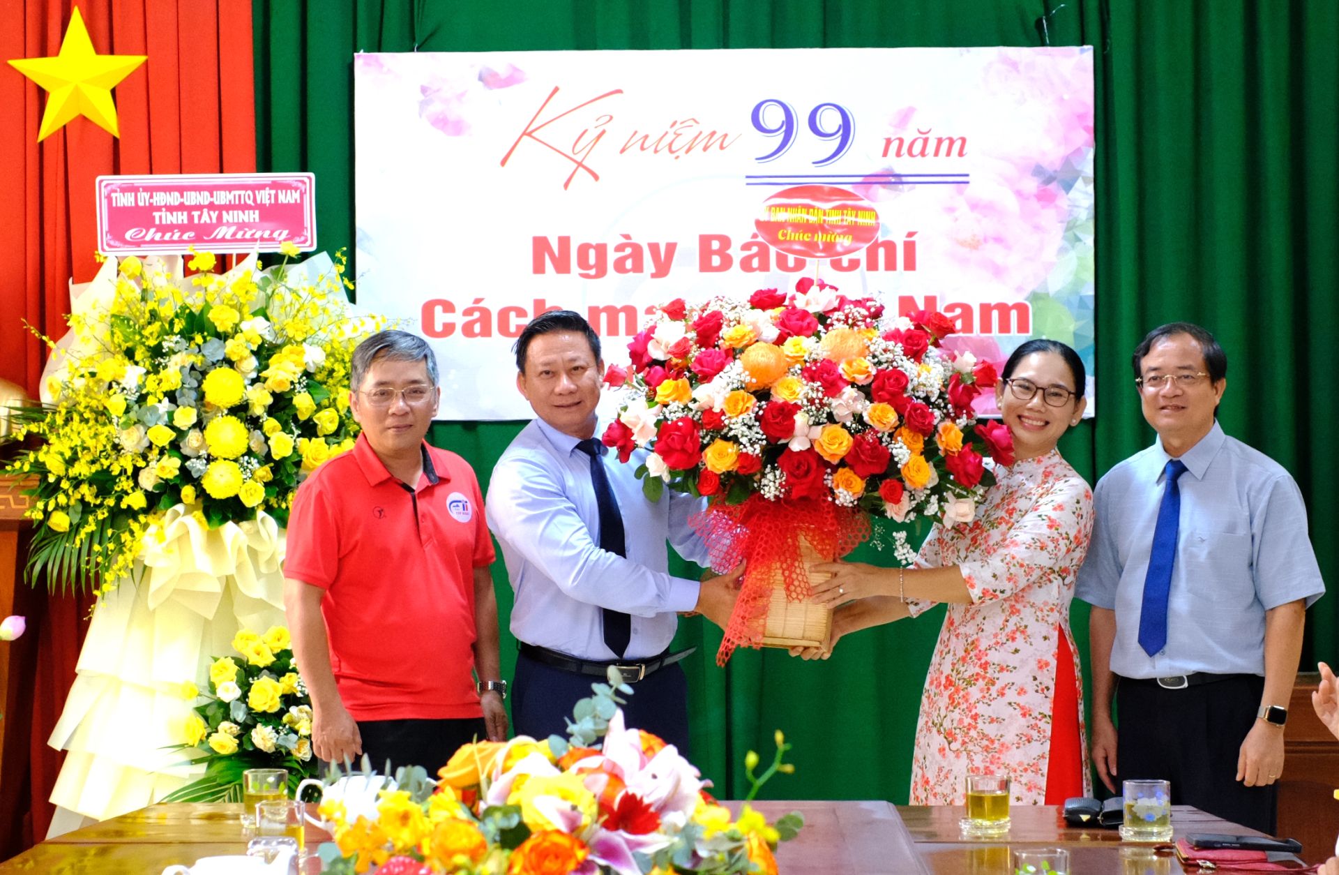 Thay mặt lãnh đạo tỉnh, Chủ tịch UBND tỉnh Nguyễn Thanh Ngọc tặng hoa và chúc mừng Ban Biên tập và tập thể phóng viên, biên tập viên, viên chức, người lao động Báo Tây Ninh nhân Ngày Báo chí Cách mạng Việt Nam 21.6.