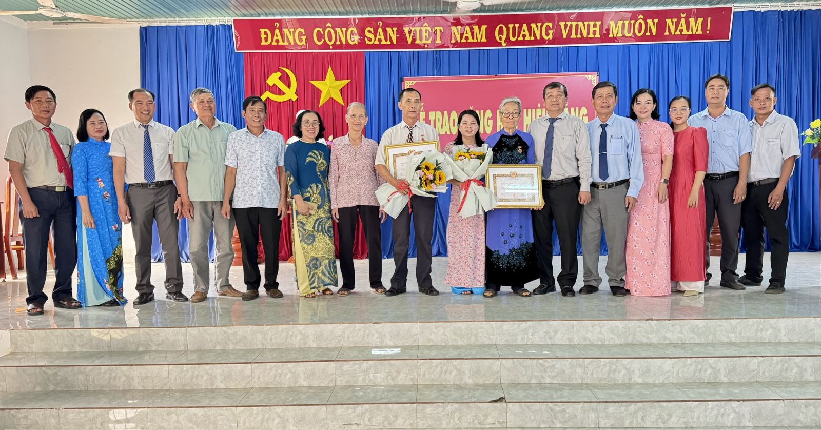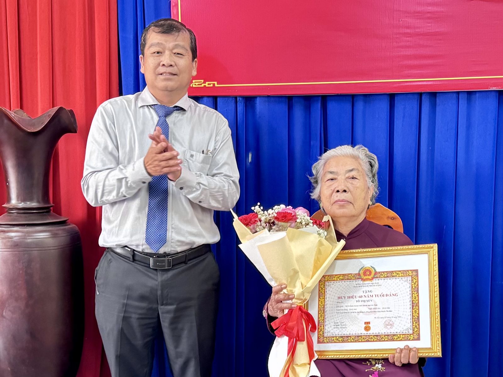 Trong đó, Huy hiệu 60 năm tuổi Đảng được trao cho các đảng viên: Đỗ Thị Miên (sinh năm 1943, quê quán xã Đại An, huyện Vũ Bản, tỉnh Nam Định), nguyên Hội trưởng Hội Phụ nữ, Chủ tịch Công đoàn huyện và đảng viên Tô Thị Yến (sinh năm 1941, quê quán xã Trí Bình, huyện Châu Thành, tỉnh Tây Ninh), sinh hoạt Đảng tại Chi bộ ấp Hoà Đông A.