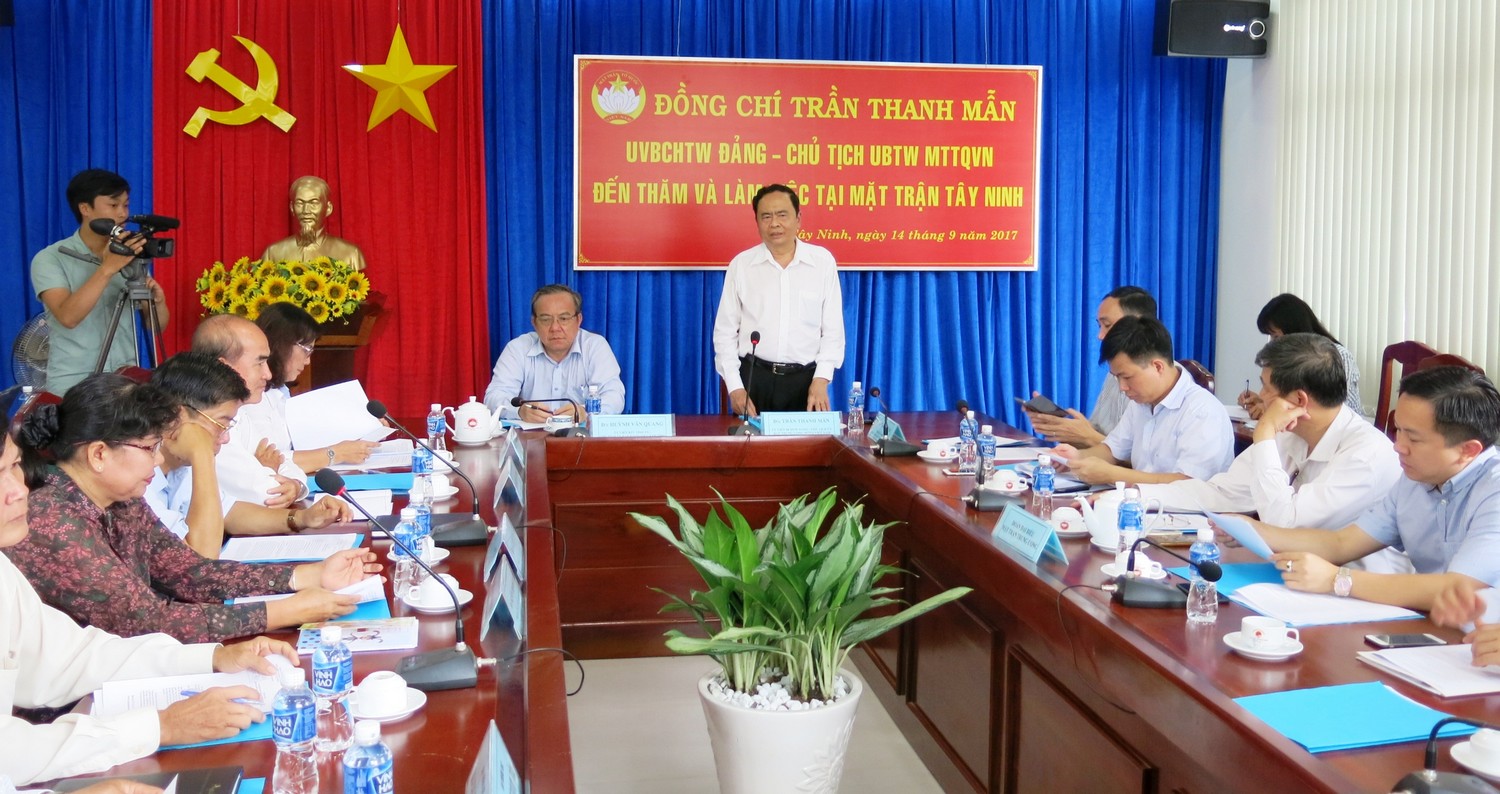 Chiều 14.9, ông Trần Thanh Mẫn - Chủ tịch Uỷ ban Trung ương Mặt trận tổ quốc Việt Nam (MTTQVN) cùng đoàn công tác đã đến và làm việc với UB.MTTQVN tỉnh Tây Ninh để nắm tình hình hoạt động của tổ chức trong 9 tháng đầu năm 2017.