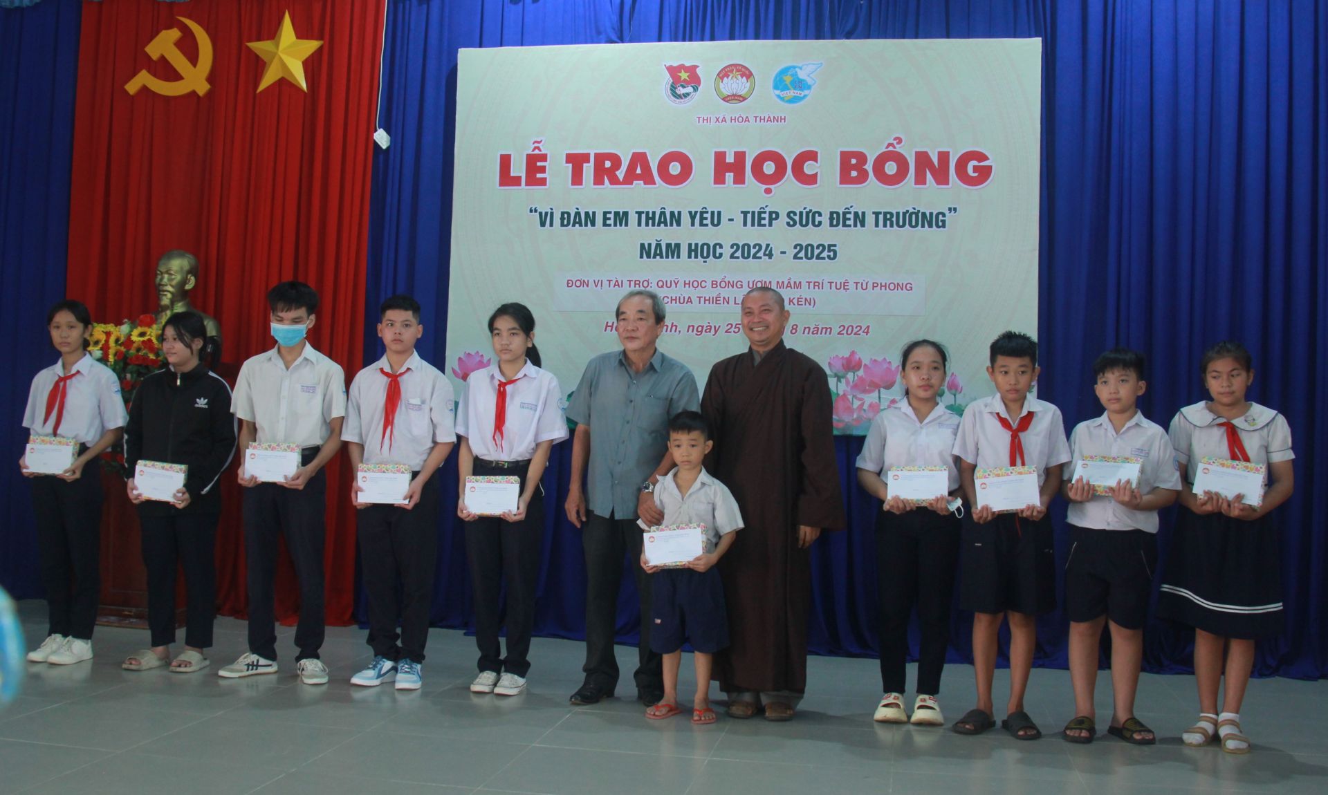 Đại đức Thích Thiện Nghĩa- Trụ trì chùa Thiền Lâm - Gò Kén và lãnh đạo thị xã Hòa Thành trao học bổng cho các em học sinh.