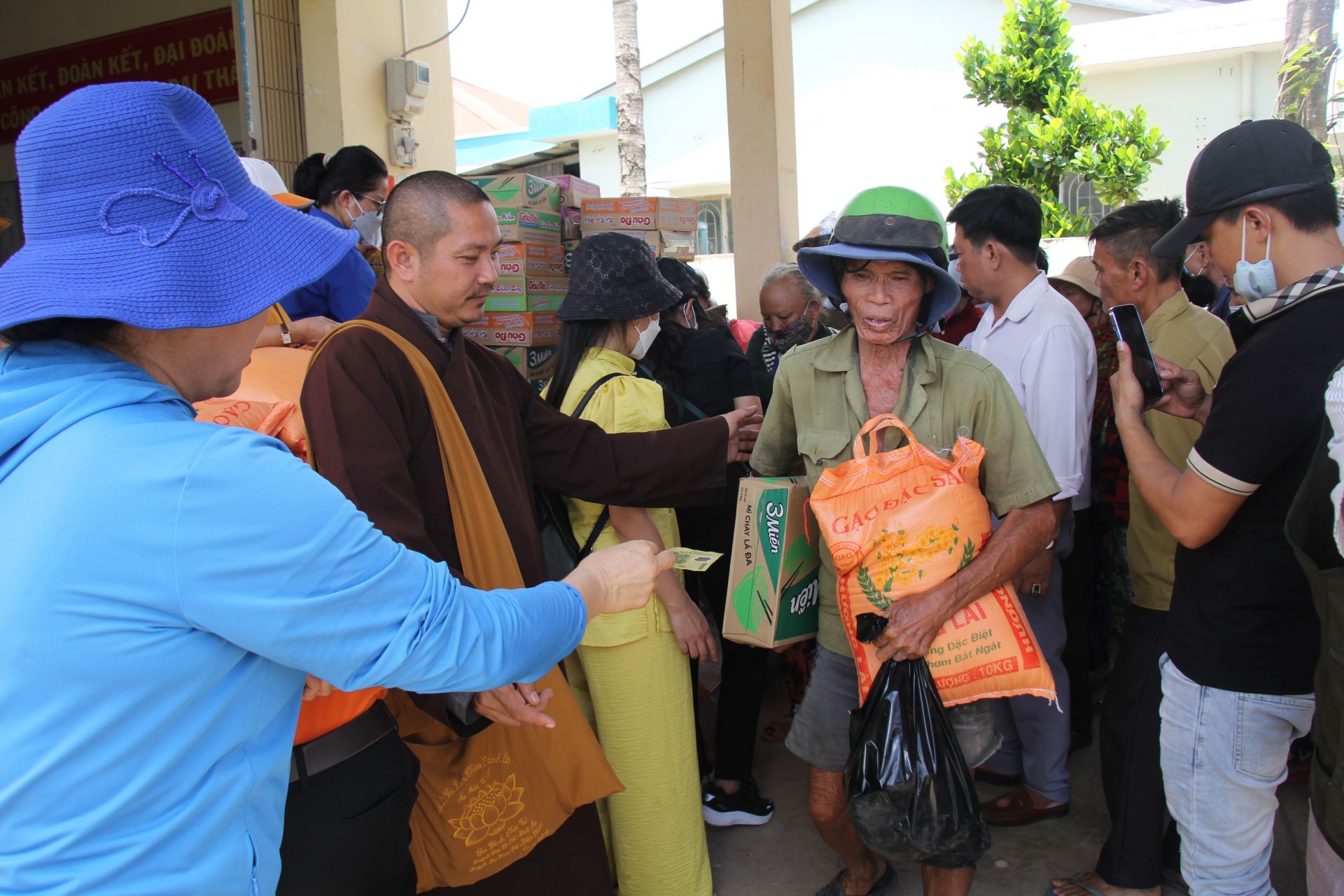 Đại đức Thích Thiện Nghĩa cùng mạnh thường quân trao quà cho các hộ nghèo tại ấp Kinh Mới, xã Hưng Điền B.