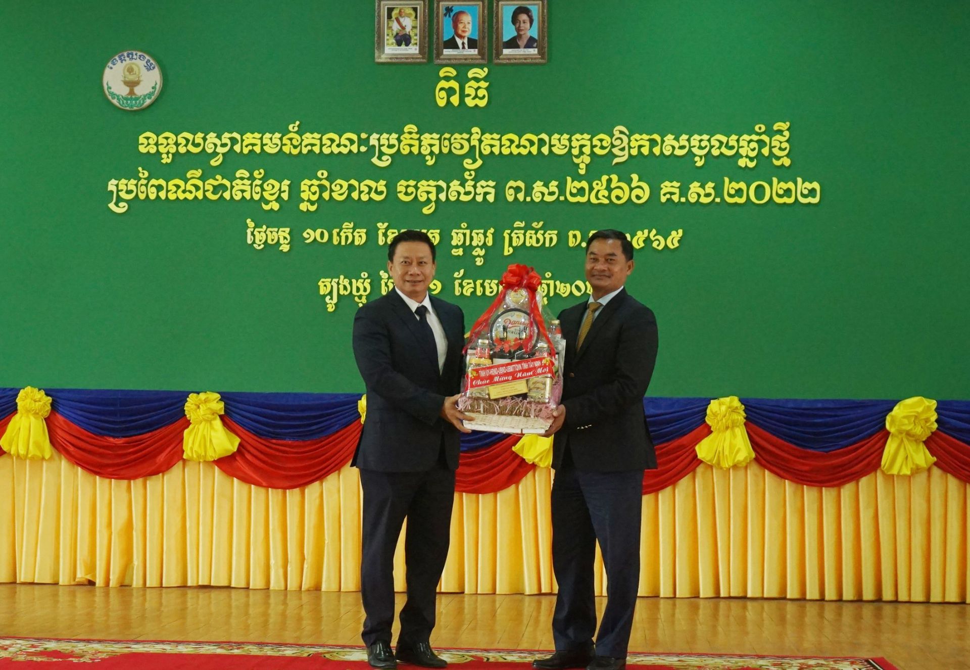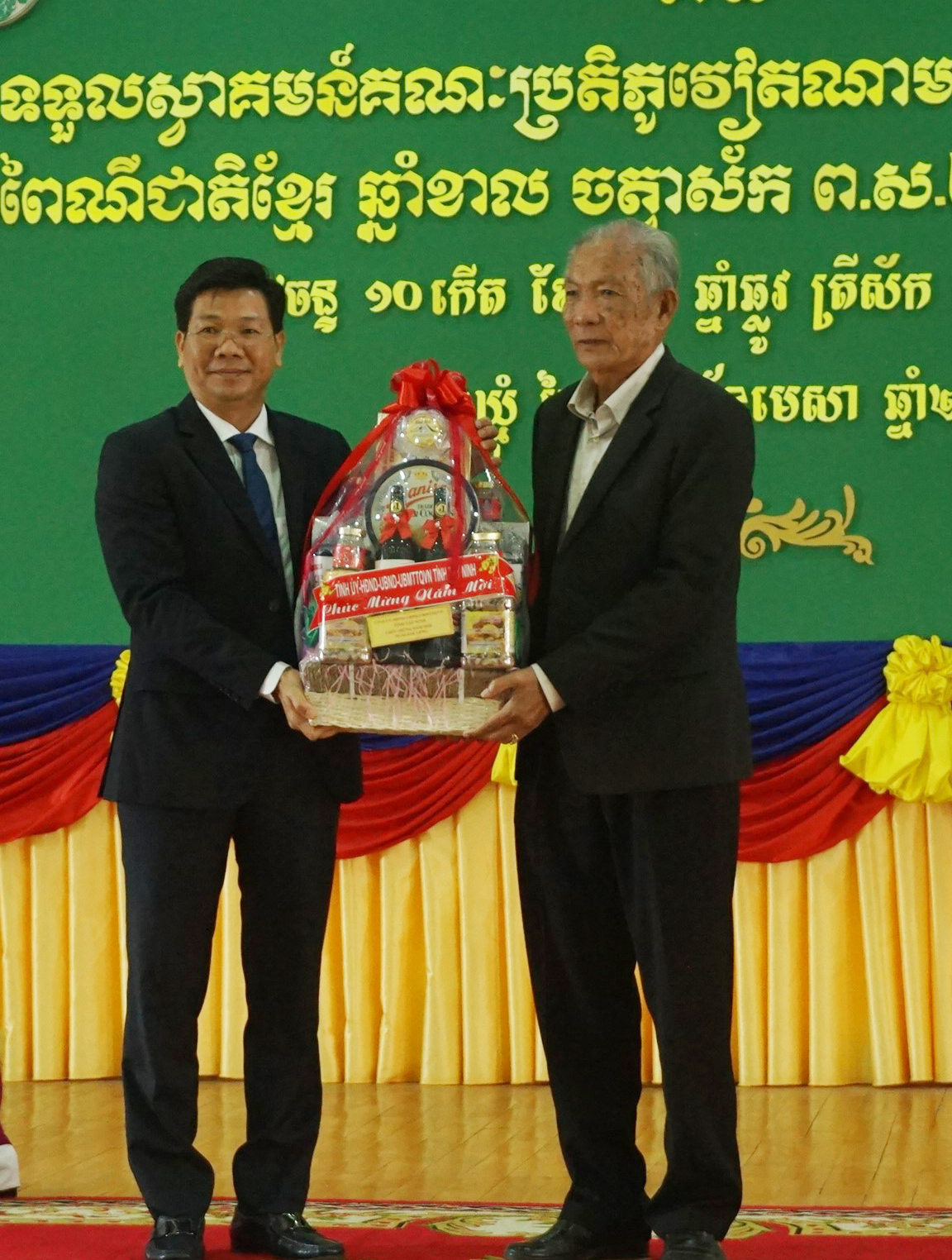 Phó Bí thư Tỉnh uỷ Tây Ninh Nguyễn Mạnh Hùng tặng quà chúc mừng năm mới Chủ tịch Hội đồng tỉnh Tboung Khmum.