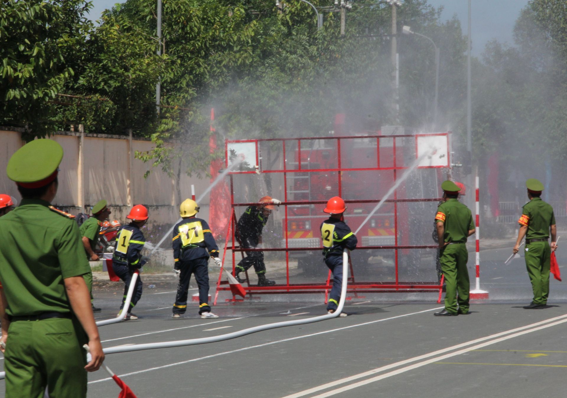 Cuối cùng là phần thi đội hình máy bơm chữa cháy phun nước vào hộp tiêu điểm dành cho lực lượng PCCC & CNCH chuyên nghiêp. Với việc luyện tập thường xuyên, các đội thi đã thực hiện các thao tác kéo, lắp các vòi và phun nước vào hộp tiêu điểm một cách nhanh nhẹn, động tác thuần thục, chính xác. Đây là phần thi nhận nhiều sự cổ vũ của khán giả.