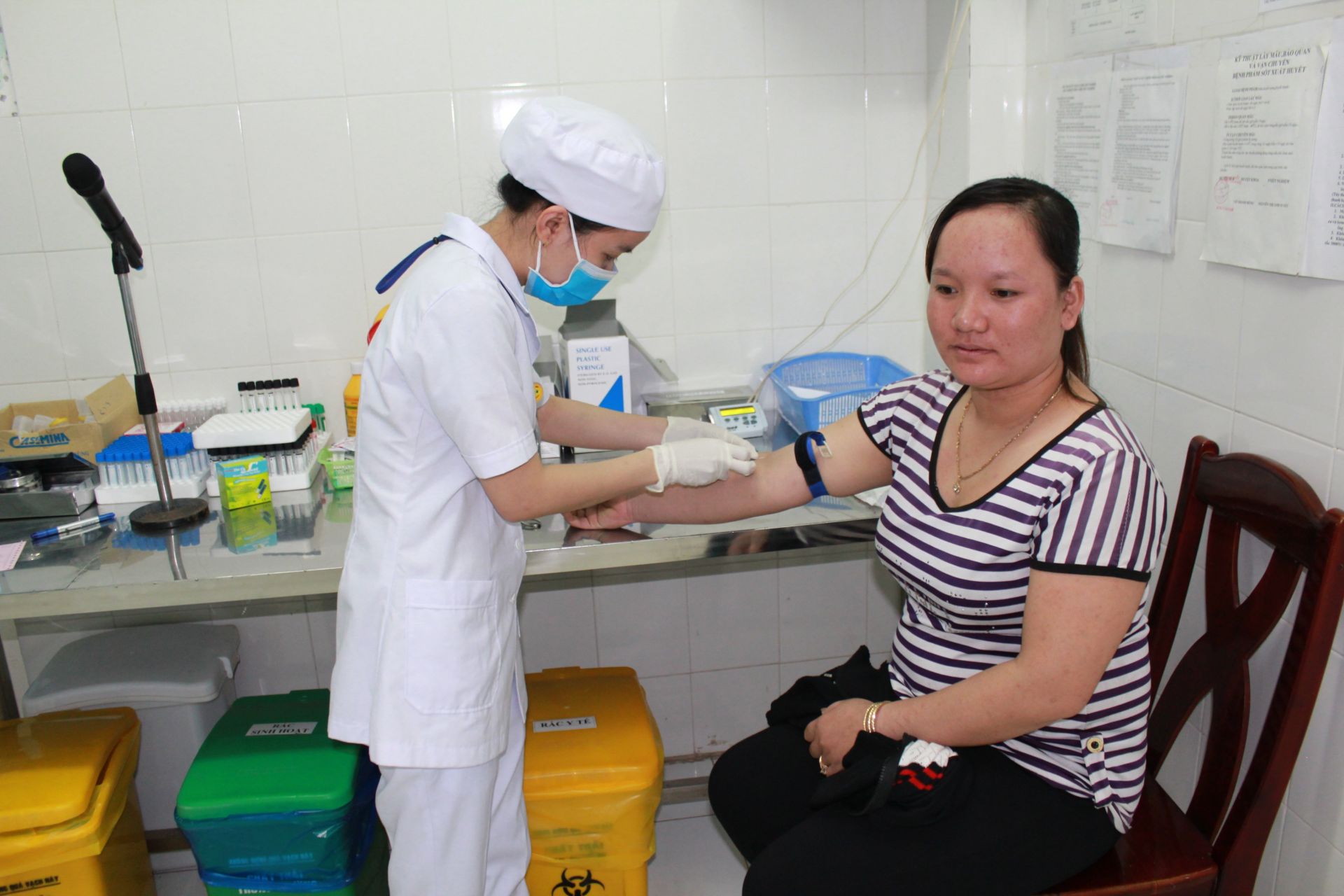 Lấy mẫu máu trước khi thực hiện hiến máu nhân đạo góp phần mang đến sự sống cho bệnh nhân tan máu bẩm sinh.