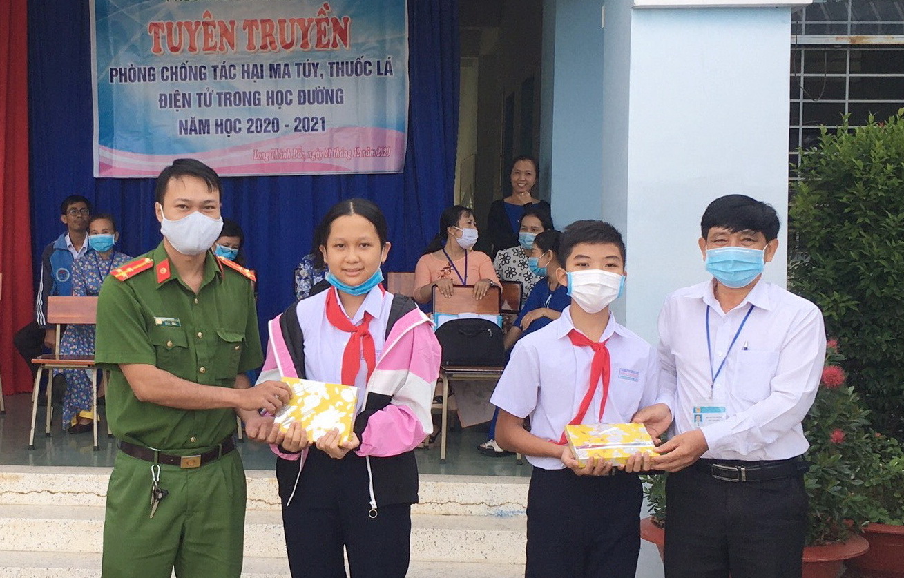 Trao quà cho các em học sinh tích cực tham gia buổi tuyên truyền phòng chống tác hại của ma tuý.