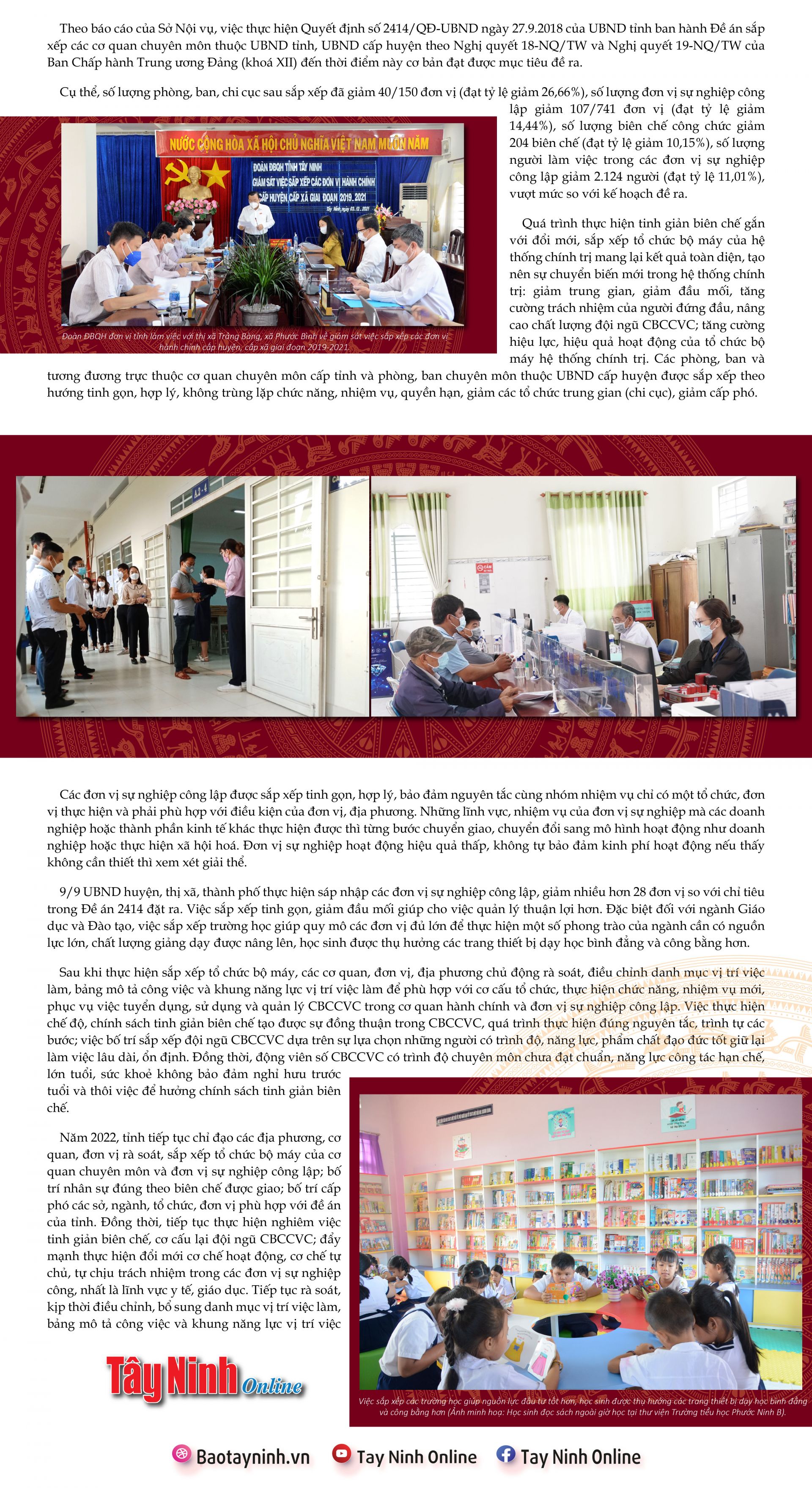 Theo báo cáo của Sở Nội vụ, việc thực hiện Quyết định số 2414/QĐ-UBND ngày 27.9.2018 của UBND tỉnh ban hành Đề án sắp xếp các cơ quan chuyên môn thuộc UBND tỉnh, UBND cấp huyện theo Nghị quyết 18-NQ/TW và Nghị quyết 19-NQ/TW của Ban chấp hành Trung ương Đảng (khoá XII) đến thời điểm này cơ bản đạt được mục tiêu đề ra. |
