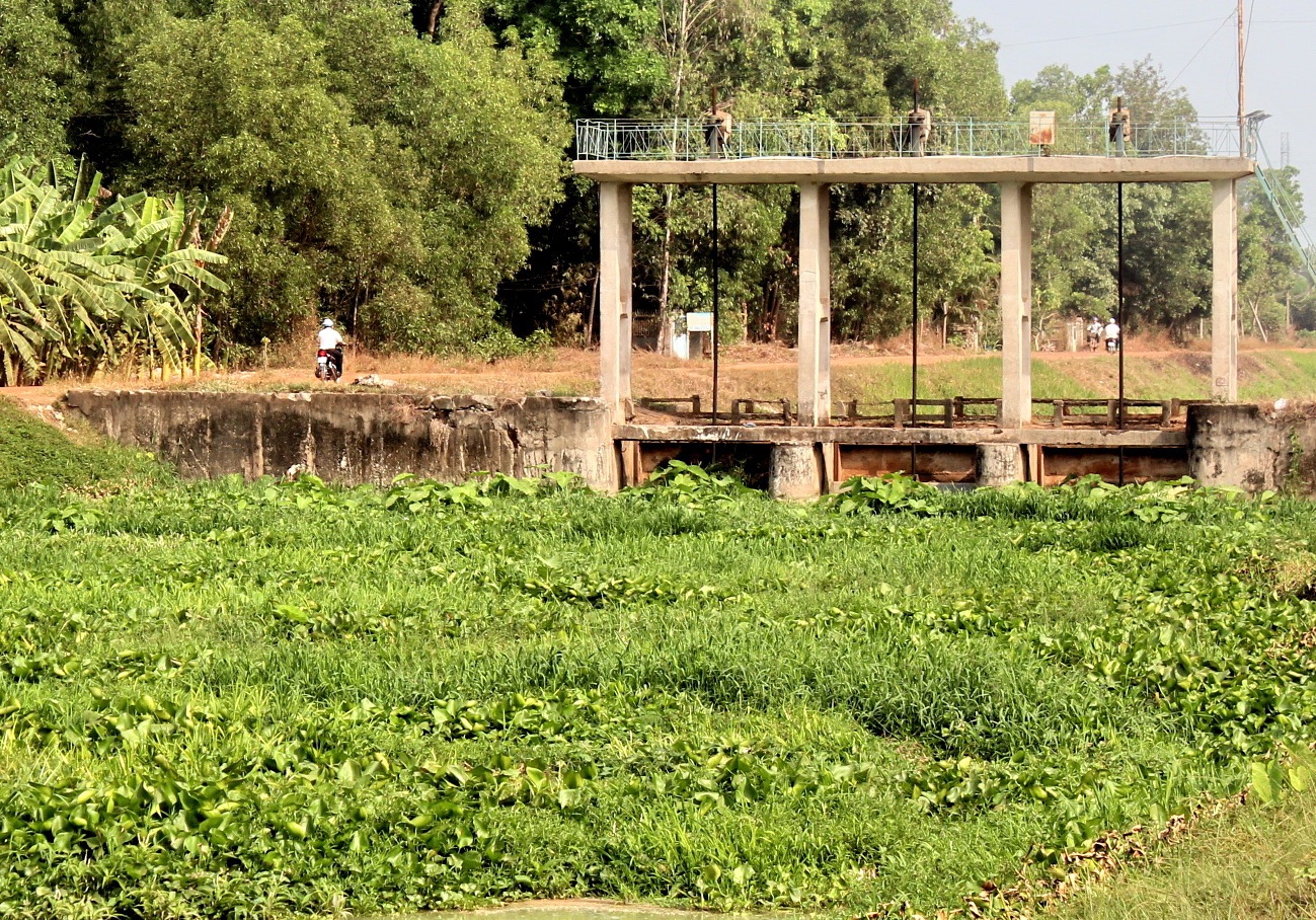 Không chỉ dòng chảy trên kênh Tây bị cản trở tại cầu K21, mà khi xuống đến chân đập điều tiết- cách cầu K21 chỉ vài trăm mét, dòng chảy tiếp tục bị một đám cỏ dại khác cản trở, tạo thành tấm thảm cỏ phủ khắp bề mặt dòng kênh.