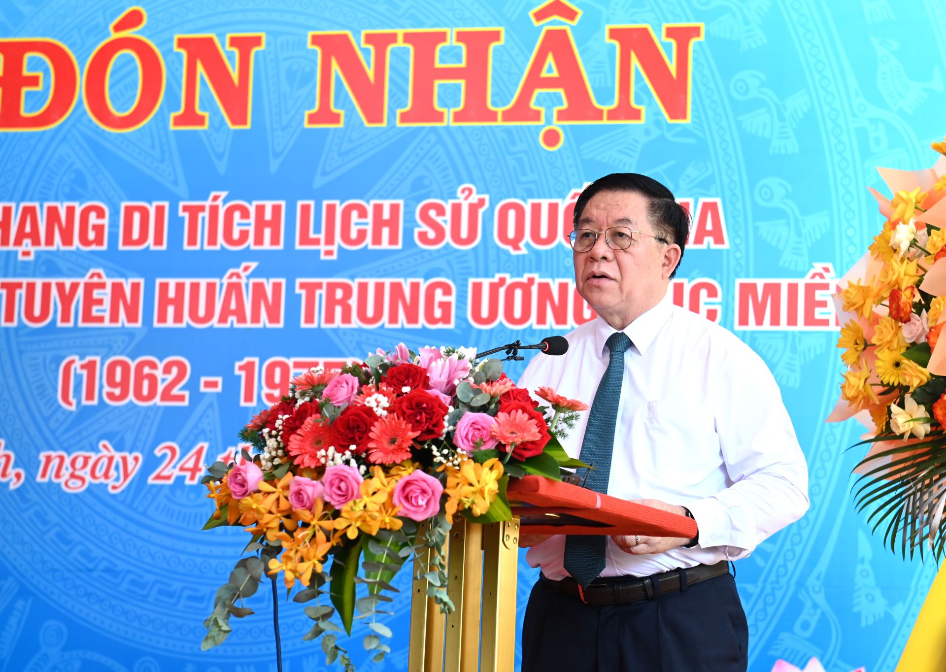 Ông Nguyễn Trọng Nghĩa- Trưởng Ban Tuyên giáo Trung ương phát biểu tại buổi lễ đón nhận bằng xếp hạng di tích lịch sử quốc gia của địa điểm Căn cứ Ban Tuyên huấn Trung ương Cục miền Nam.
