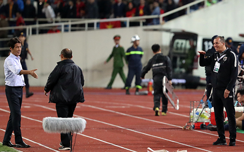 Hành động khó hiểu của trợ lý đội tuyển Thái Lan. Ảnh: Đức Đồng.
