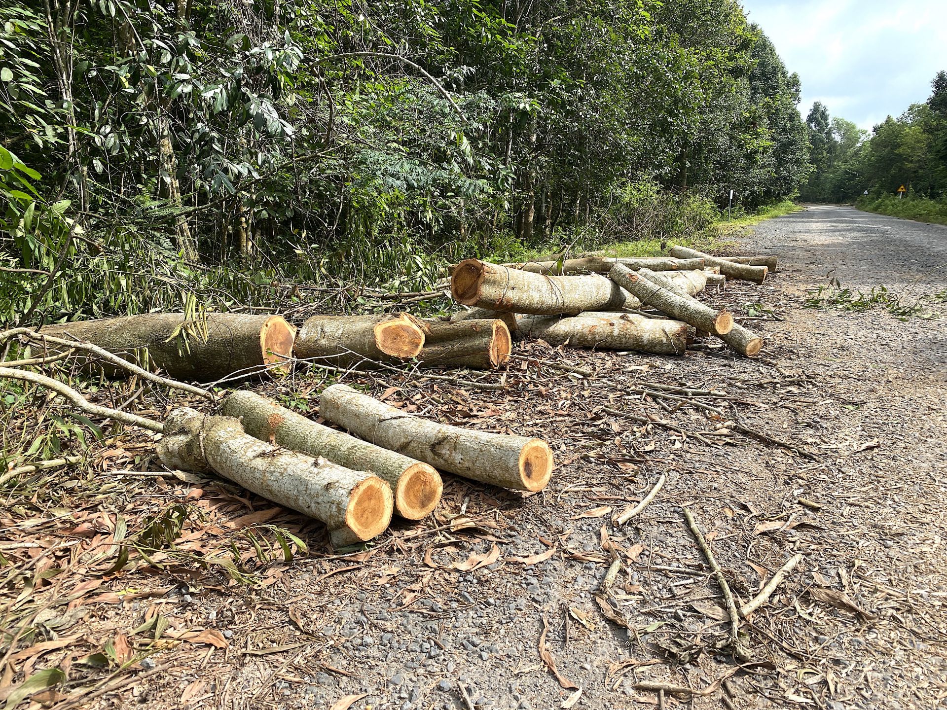 Gỗ nằm la liệt hai bên đường ven rừng lịch sử Bời Lời.