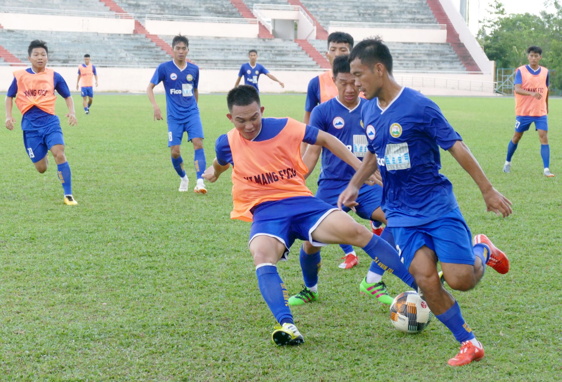 Pha tranh chấp trong trận tập cuối cùng của các cầu thủ XM Fico-YTL TN, trước khi lên đường tham dự vòng loại Cúp QG vào chiều 22.5