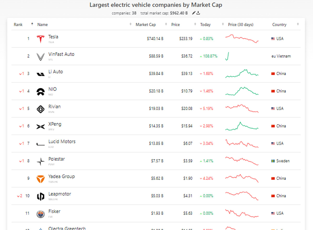 Vốn hóa của VinFast lên thứ 2 thế giới trong các hãng EV.