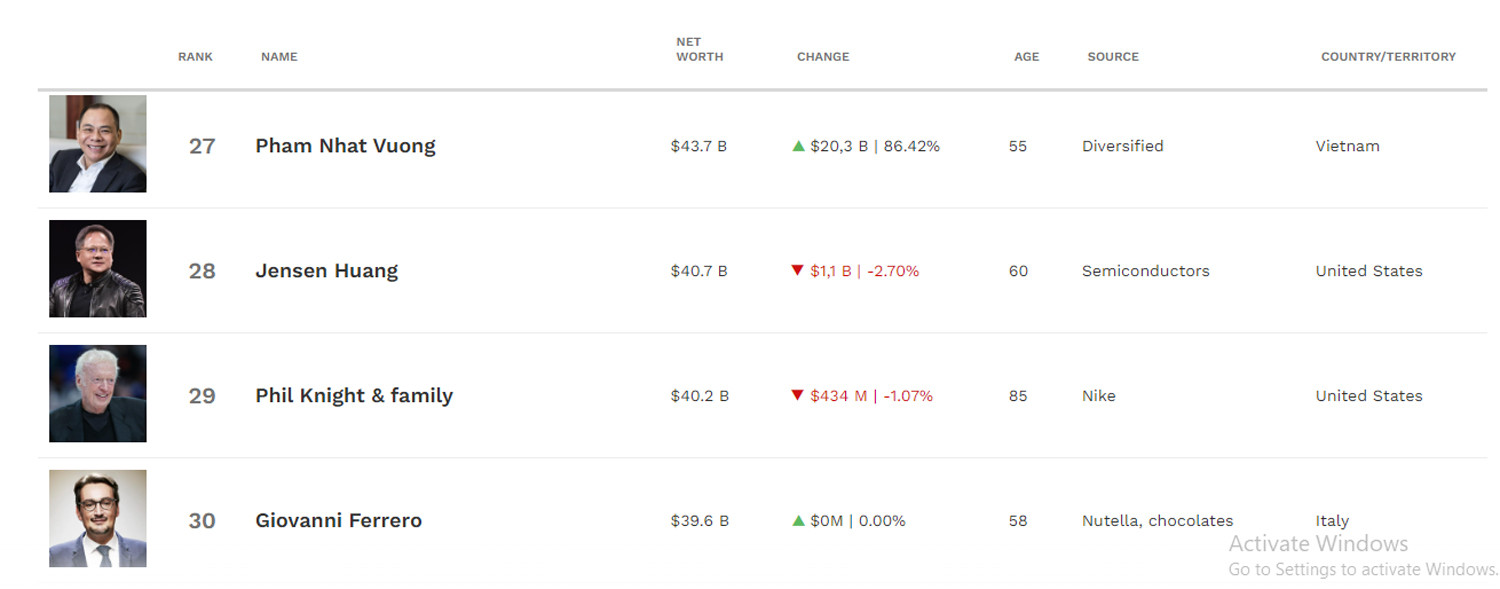 Ông Phạm Nhật Vượng giàu thứ 27 trên thế giới.
