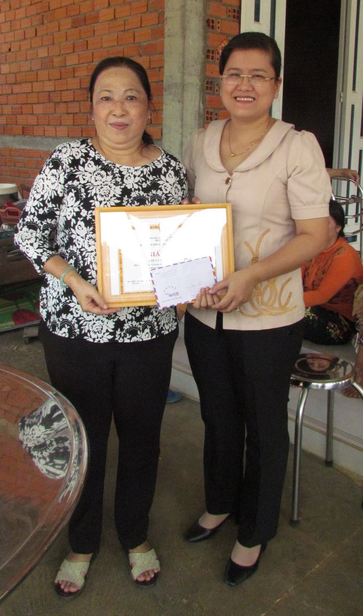 Bà Lê Phước Mỹ (bên trái)- Bí thư Chi bộ ấp Lộc Trát được Bí thư Đảng uỷ xã Gia Lộc khen thưởng.
