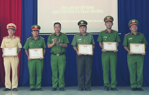 Trung tá Lê Trung Quốc- Trưởng CA Dương Minh Châu trao giấy khen của CA tỉnh cho các tập thể và cá nhân.