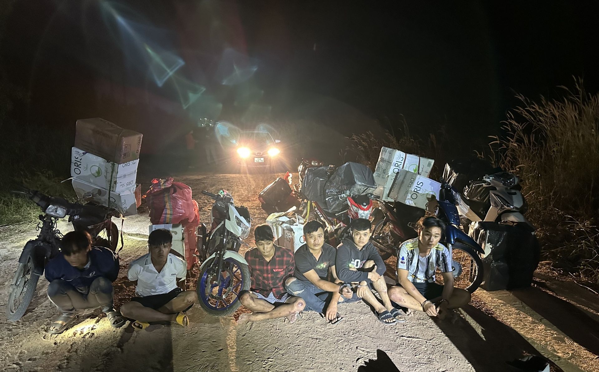 Cùng thời điểm này, lực lượng Công an phát hiện 6 đối tượng khác gồm: Nguyễn Văn Hải, sinh năm 1987; Nguyễn Văn Trung, sinh năm 2001; Nguyễn Văn Thương, sinh năm 2001; Nguyễn Văn Nho, sinh năm 1996; Nguyễn Văn Hiếu, sinh năm 2003; Phan Tường Minh, sinh năm 2000; Võ Thanh Hùng, sinh năm 1998 và Nguyễn Thành Đạt, sinh năm 1999 (cùng ngụ huyện Gò Dầu) điều khiển 6 xe mô tô chở nhiều thùng carton từ khu vực biên giới vào nội địa. Lực lượng Công an yêu cầu các đối tượng dừng xe kiểm tra, phát hiện 6 đối tượng chở 10.480 bao thuốc lá nhiều nhãn hiệu không hoá đơn chứng từ.