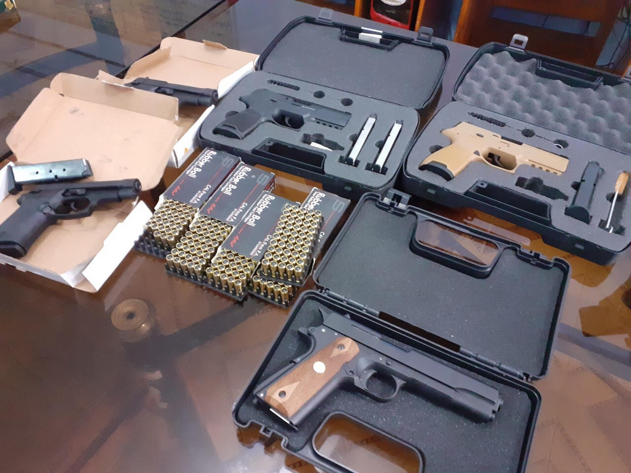 Lực lượng Công an kiểm tra 2 bọc nilon, phát hiện bên trong có chứa 5 cây súng gồm: 2 khẩu súng loại RETAY 84FS, 2 khẩu súng loại SIGSAUER P320, 1 khẩu loại AK-SA ARMS AK1911; 9 hộp tiếp đạn, 243 viên đạn đầu nhựa.