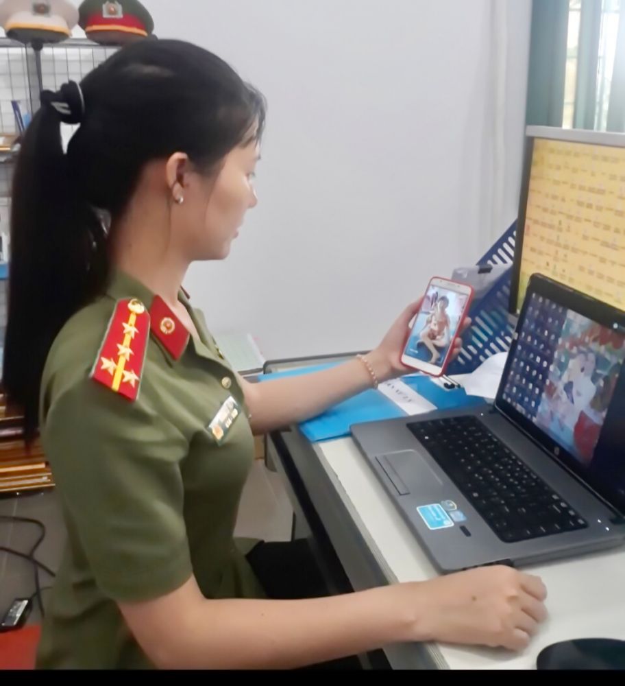 Đại úy Hoàng Lệ Thủy-cán bộ Đội Tổng hợp, một trong số ít cán bộ nữ của công an huyện Tân Biên, đã xếp công việc gia đình, gửi con nhỏ cho ông bà ngoại chăm sóc để ở lại cùng anh em cơ quan tập trung công tác.