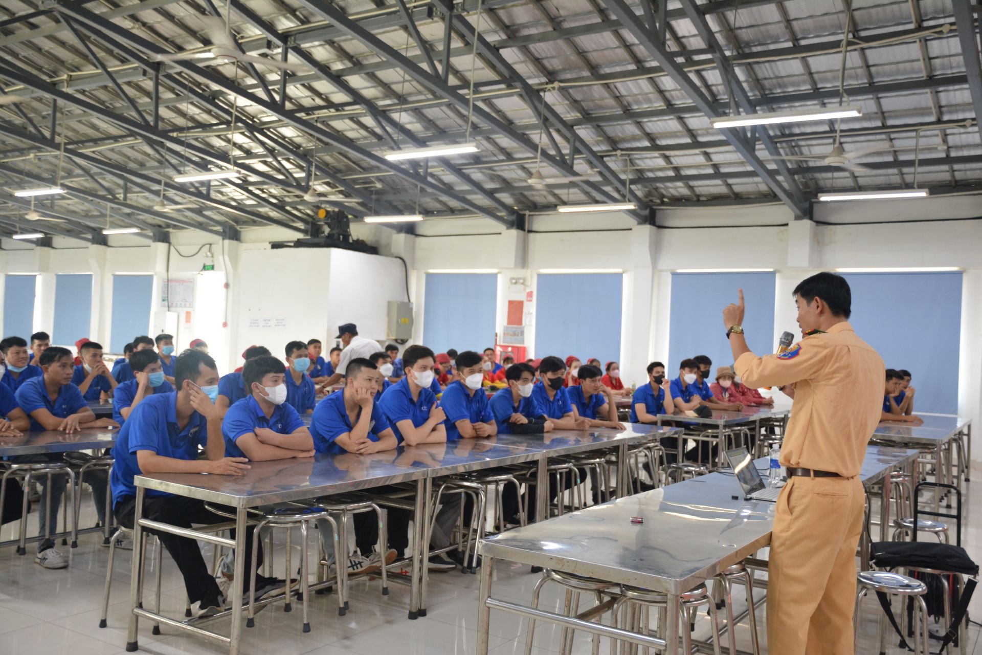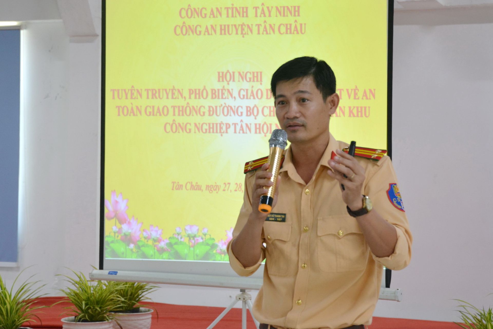 Trung tá Bùi Vũ Thanh Tài- cán bộ Đội Cảnh sát giao thông Công an huyện Tân Châu tuyên truyền cho công nhân, người lao động tại cụm công nghiệp Tân Hội