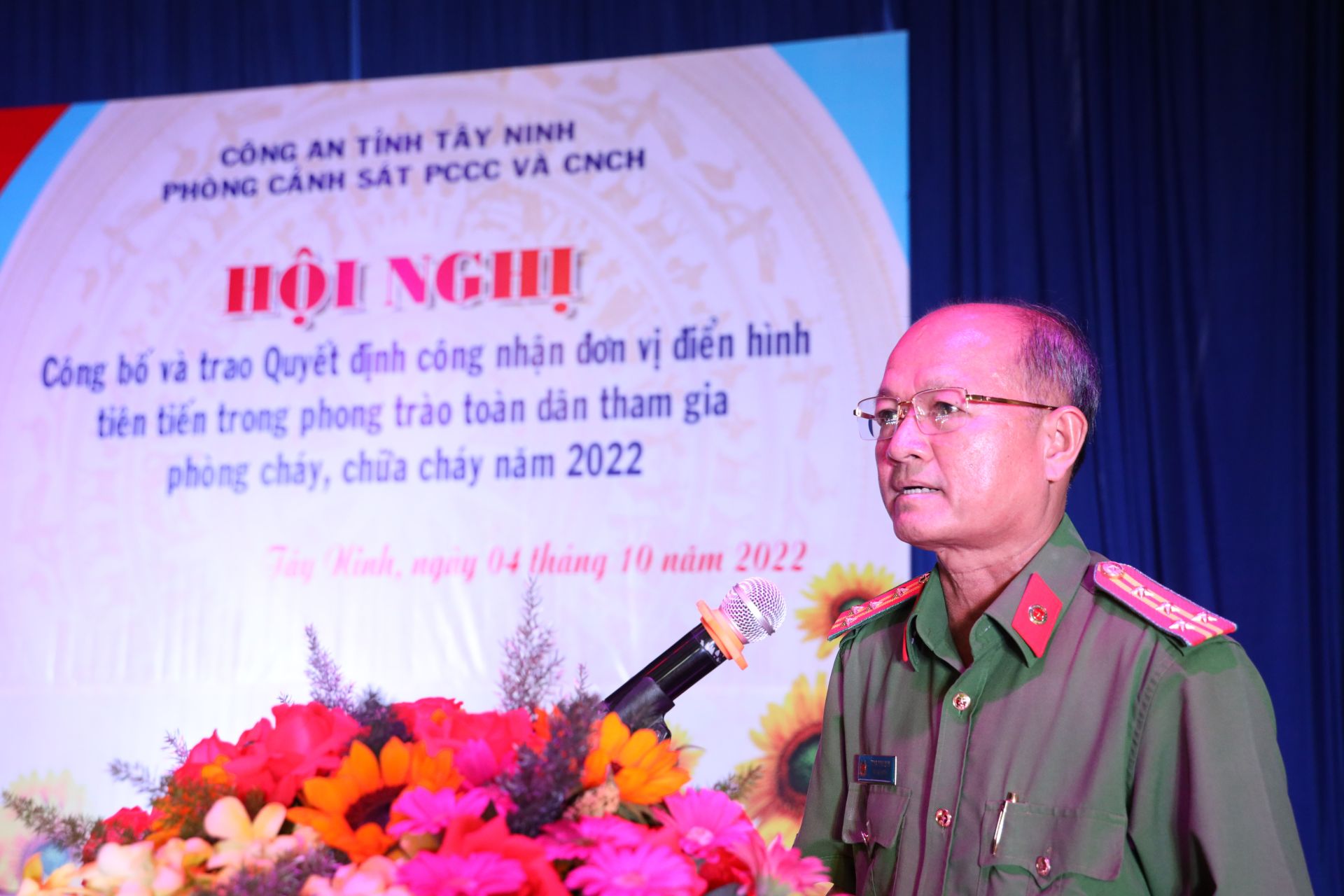 Sáng 4.10, Công an Tây Ninh tổ chức hội nghị công bố và trao quyết định công nhận đơn vị điển hình tiên tiến trong phong trào Toàn dân tham gia phòng cháy chữa cháy năm 2022. Tham dự hội nghị có Đại tá Trần Văn Luận- Phó Giám đốc Công an tỉnh.