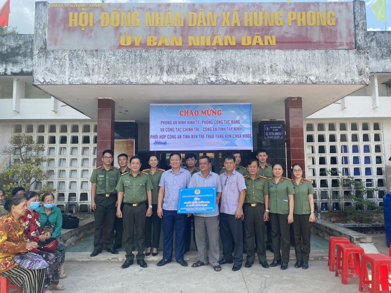 Ngày 11.5, Ban Phụ nữ Phòng Công tác Đảng và Công tác chính trị, Phòng An ninh Kinh tế Công an tỉnh phối hợp vận chuyển, trao và tặng 20 khối nước ngọt, 30 bồn chứa nước khối lượng 500 lít cho người dân 2 xã Phước Long và Hưng Phong, huyện Giồng Trôm, tỉnh Bến Tre.