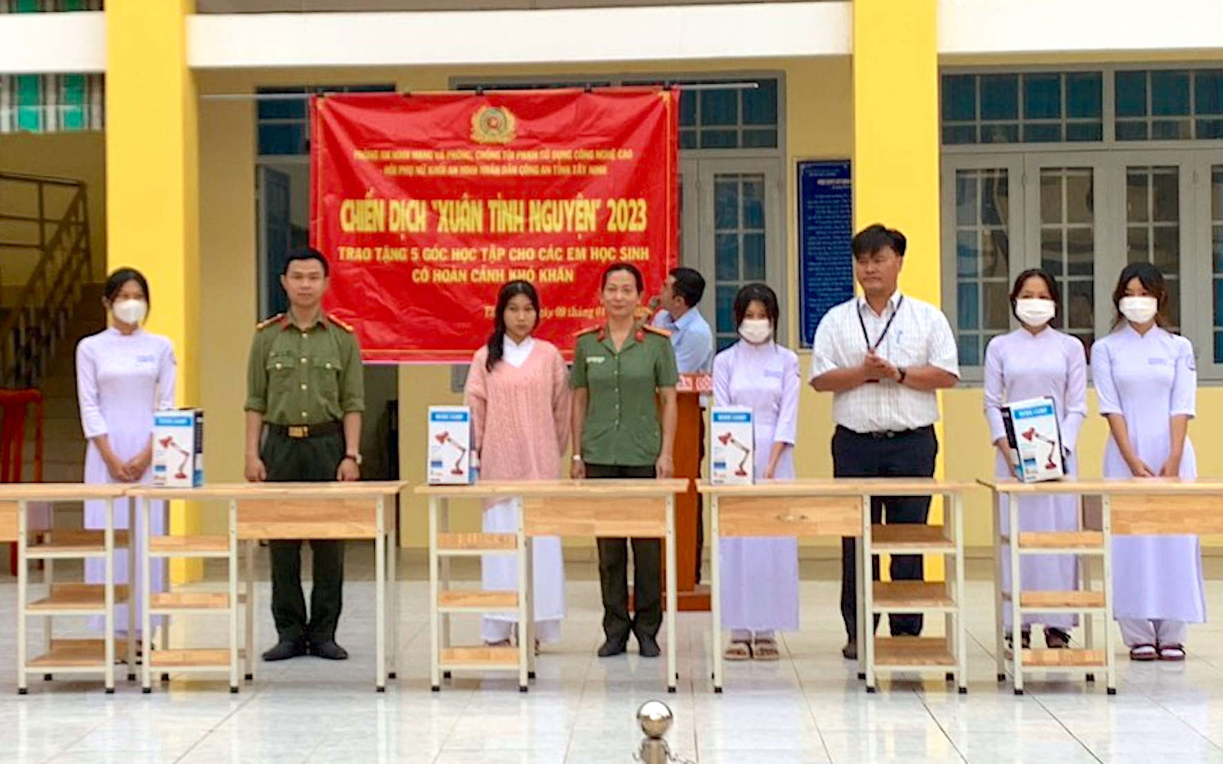 Hưởng ứng chiến dịch Xuân tình nguyện năm 2023, ngày 9.1, Chi đoàn Phòng An ninh mạng và phòng, chống tội phạm sử dụng công nghệ cao phối hợp Hội Phụ nữ khối An ninh nhân dân (Công an Tây Ninh) tổ chức chương trình trao tặng góc học tập cho học sinh có hoàn cảnh khó khăn trên địa bàn huyện Tân Châu.