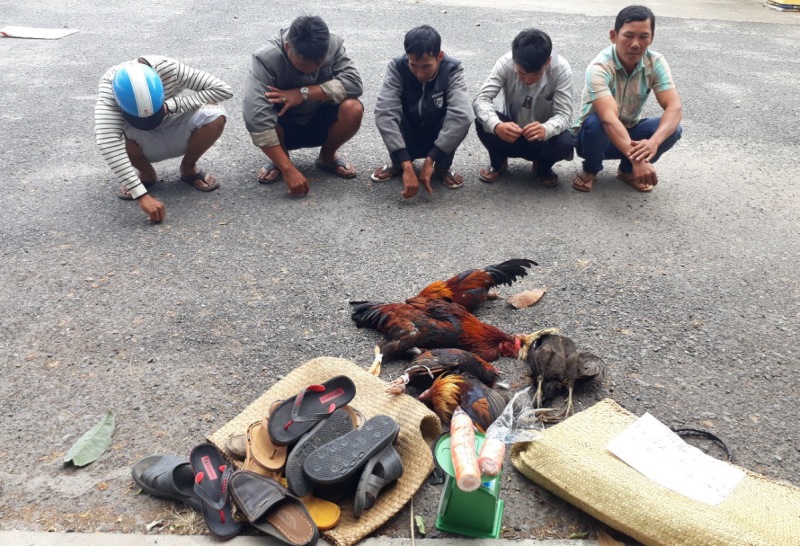 Trước sự xuất hiện bất ngờ của lực lượng Công an, nhiều con bạc bỏ chạy. Lực lượng Công an đã tạm giữ tại hiện trường 5 đối tượng và tang vật gồm 11 xe mô tô, 5 con gà đá, cân đồng hồ, cựa sắt...