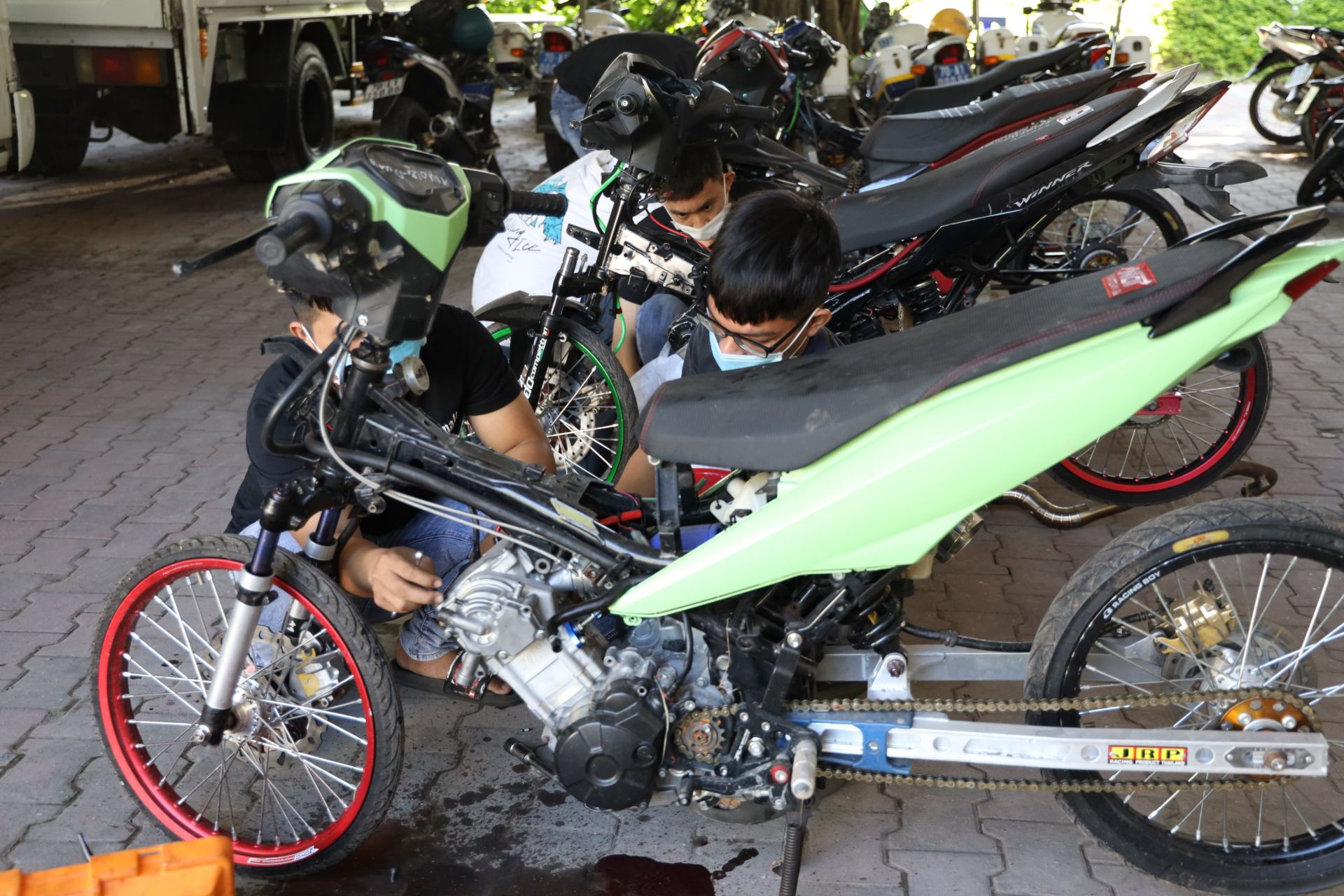 Các đối tượng đang tháo gỡ các bộ phận lấp, gắn thêm trên xe mô tô không đúng quy định.
