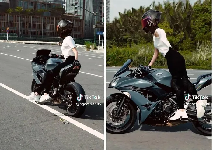 Ngọc trinh điều khiển xe mô tô trên đường với nhiều động tác nguy hiểm. Ảnh: CA