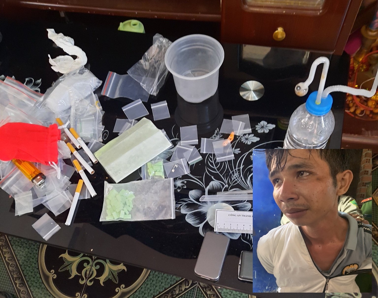 Khi thấy lực lượng Công an, Thy cầm bịch nylon có chứa nhiều viên nén màu xanh ném xuống đường, còn Sa điều khiển xe chở Thy bỏ chạy. Công an thu giữ 145 viên nén hình chữ nhật và 19 viên nén hình chữ nhật không còn nguyên vẹn và một số chất bột màu xanh do số viên nén bị bể. Đến khoảng 9 giờ ngày 17.1, cả hai đối tượng Thy và Sa đã bị Công an TP.Tây Ninh bắt giữ khi đang lẩn trốn.