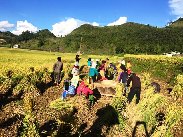 Bà con nông dân Lũng Cú, Hà Giang gặt lúa.