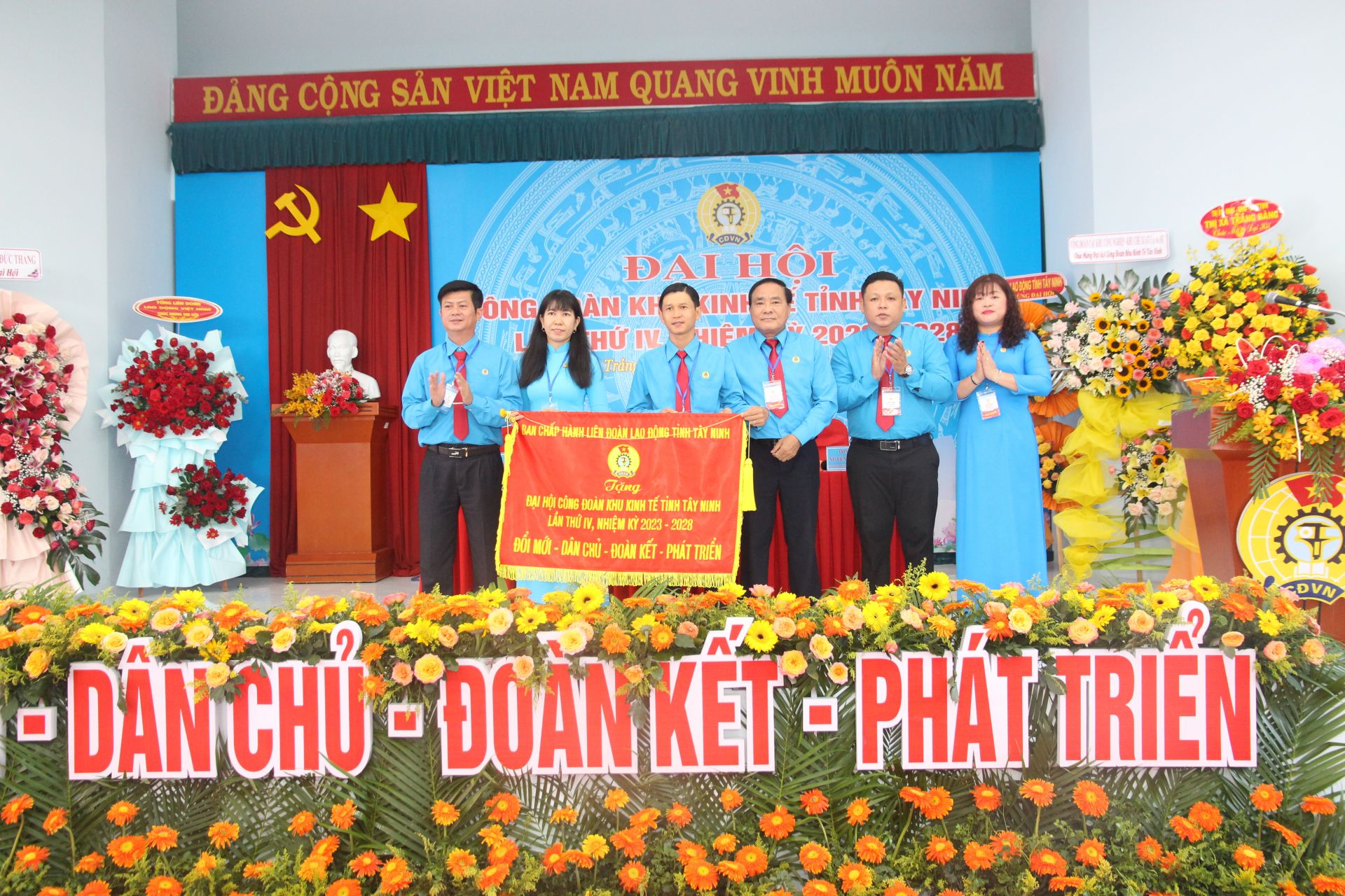 Ông Trần Lê Duy - Chủ tịch Liên đoàn Lao động tỉnh (bên trái trong ảnh) trao bức trướng chúc mừng Đại hội cho Ban chấp hành Công đoàn Khu Kinh tế tỉnh.
