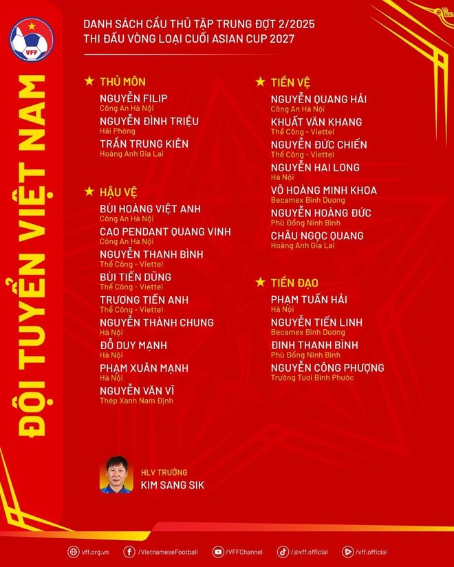 Ngày 22-5, HLV trưởng Kim Sang-sik công bố danh sách tập trung đội tuyển Việt Nam chuẩn bị cho trận đấu gặp đội tuyển Malaysia, trong khuôn khổ lượt trận thứ 2 bảng F – Vòng loại cuối Asian Cup 2027.