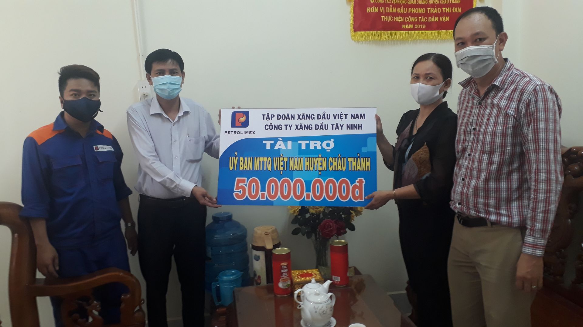 Hưởng ứng Lời kêu gọi Toàn dân tham gia phòng, chống dịch Covid-19 của UB.MTTQVN tỉnh Tây Ninh, Công ty Xăng dầu Tây Ninh trao hỗ trợ lương thực, thực phẩm, vật tư y tế cho MTTQ huyện Châu Thành.