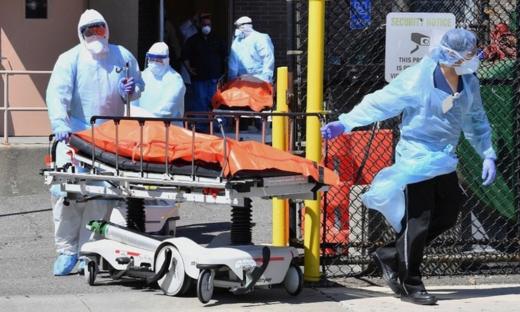 Nhân viên y tế vận chuyển thi thể một bệnh nhân tử vong do Covid-19 ở New York, Mỹ, hôm 2/4. Ảnh: AFP