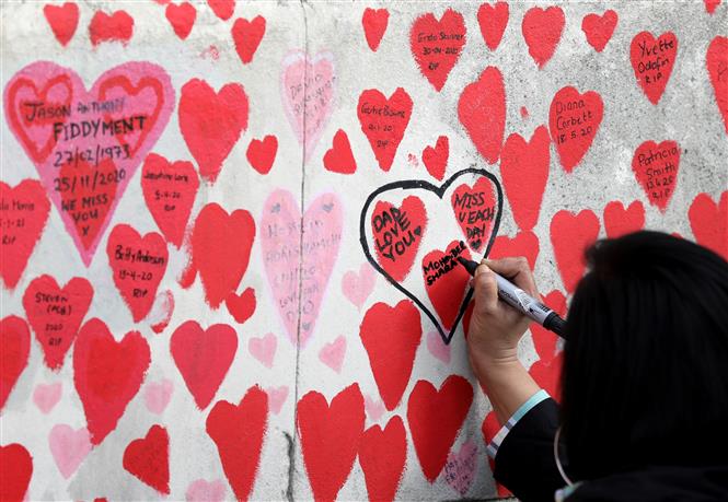 Viết thông điệp lên bức tường tưởng nhớ các bệnh nhân nhiễm COVID-19 ở London, Anh, ngày 27/3/2022. Ảnh: THX/TTXVN