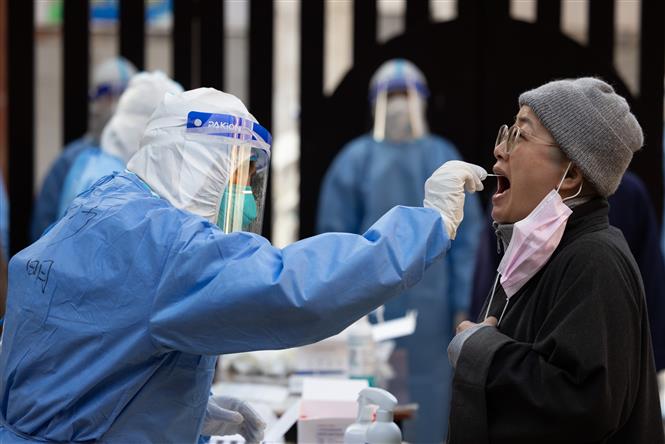 Nhân viên y tế lấy mẫu xét nghiệm COVID-19 cho người dân tại Thượng Hải, Trung Quốc, ngày 4/4/2022. Ảnh: THX/TTXVN
