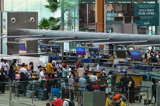 Hành khách làm thủ tục tại sân bay quốc tế Changi, Singapore, ngày 1/4/2022. Ảnh: AFP/TTXVN