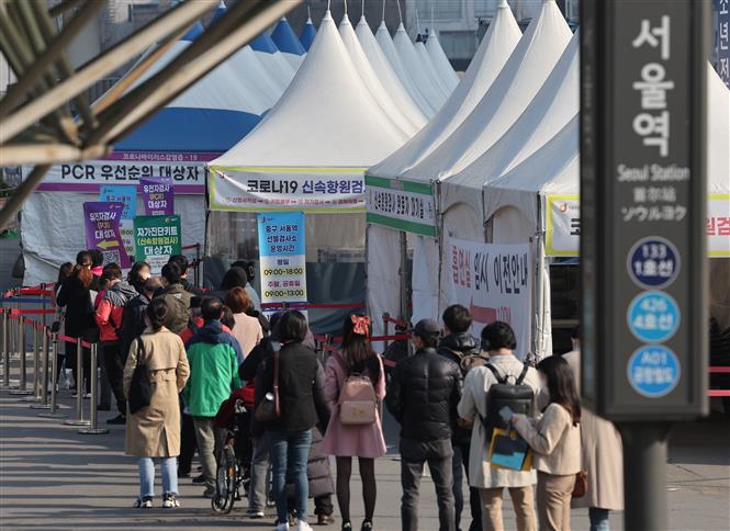 Người dân xếp hàng chờ xét nghiệm COVID-19 tại Seoul, Hàn Quốc, ngày 4/4/2022. Ảnh: Yonhap/ TTXVN