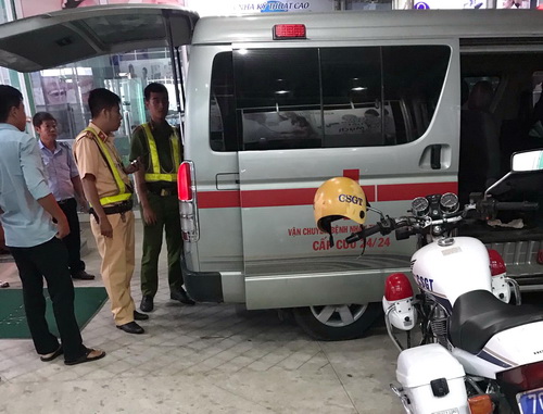 Hai chiến sĩ CSGT giúp gia đình cháu bé chuyển viện.