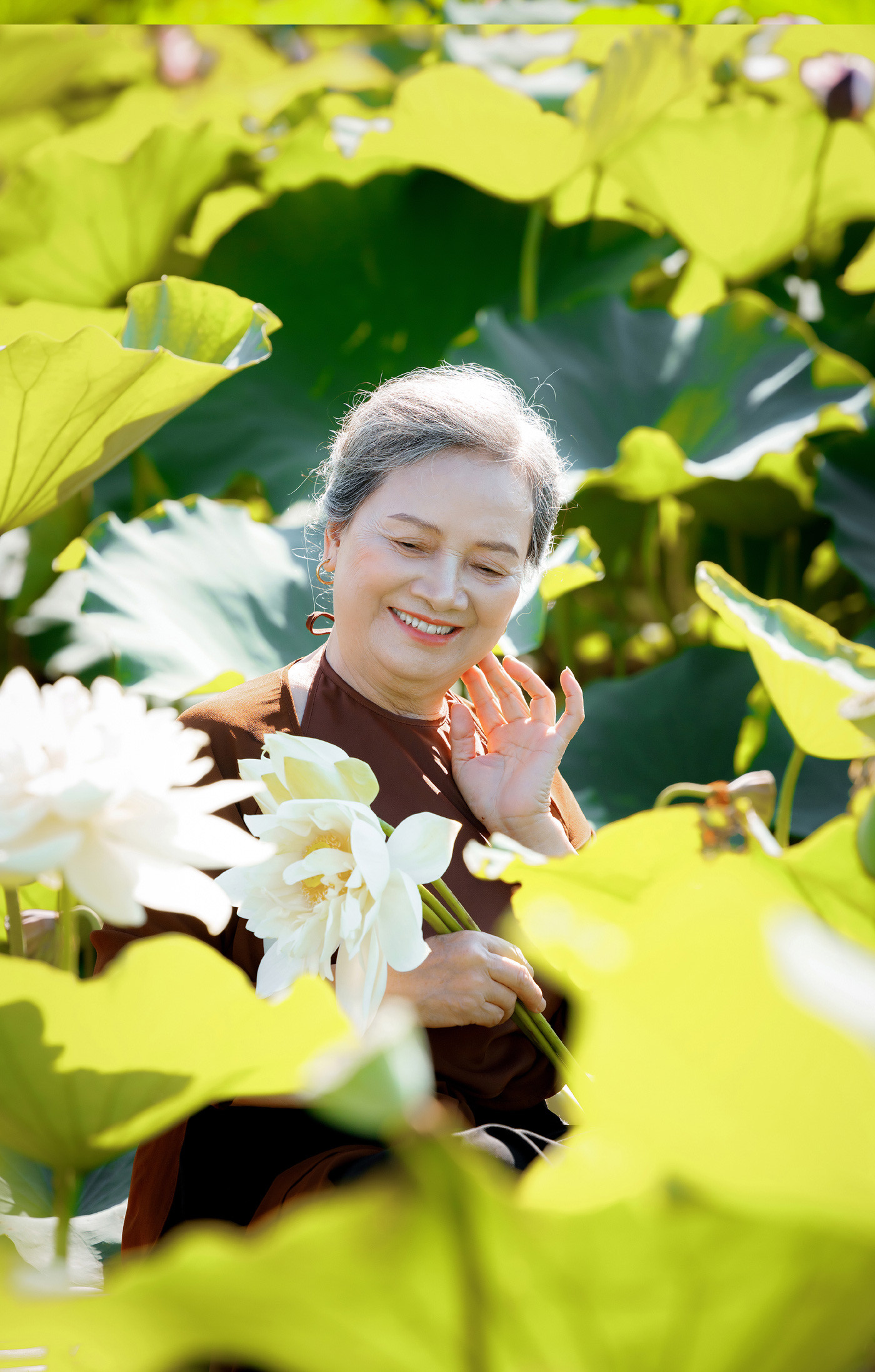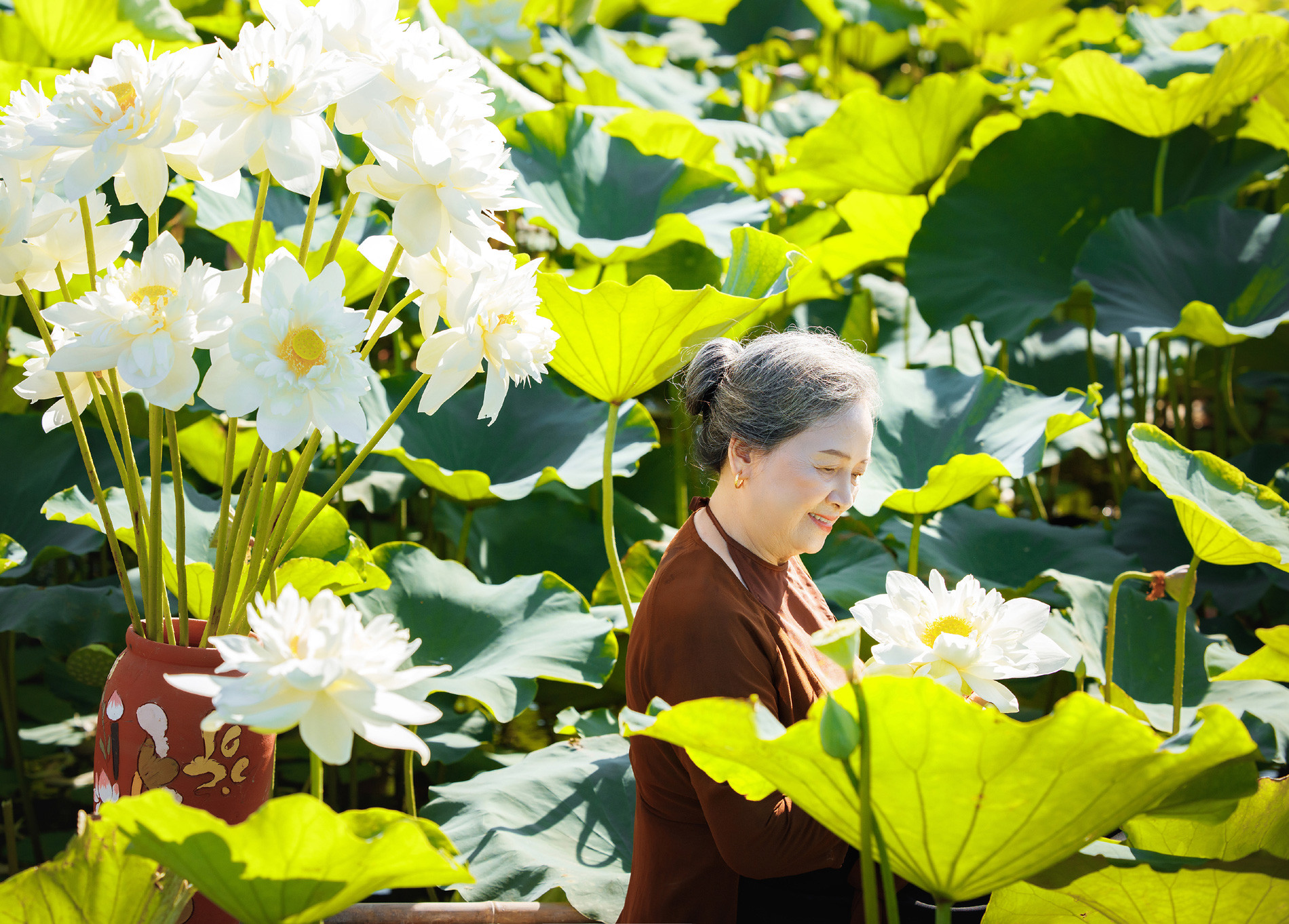 Một số hình ảnh đẹp của cụ bà U80 chụp với sen:
