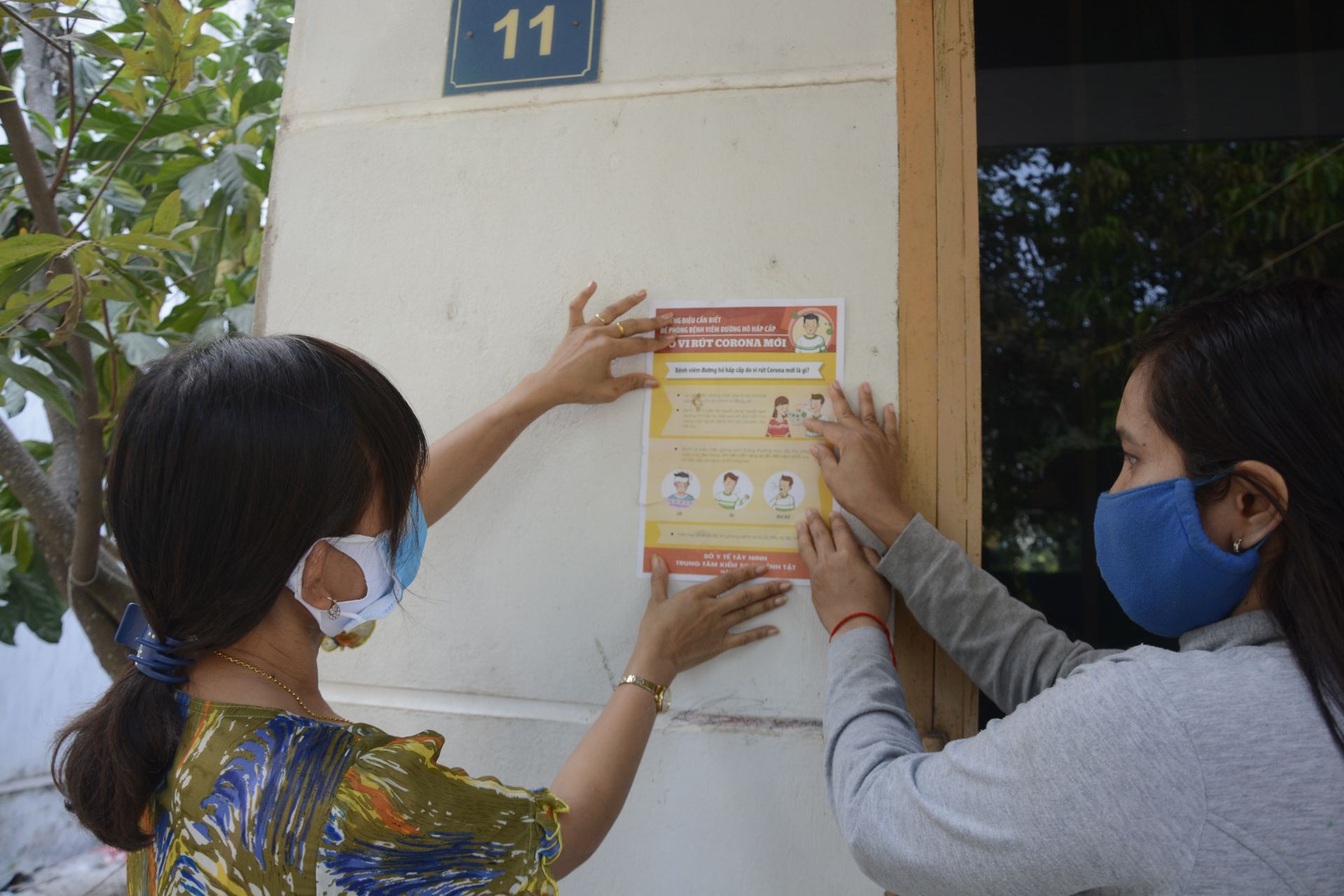 Cán bộ MTTQVN xã Suối Đá, huyện Dương Minh Châu dán tờ rơi tuyên truyền biện pháp phòng, chống dịch Covid-19 cho đồng bào Tà Mun. Ảnh: Hải Đăng