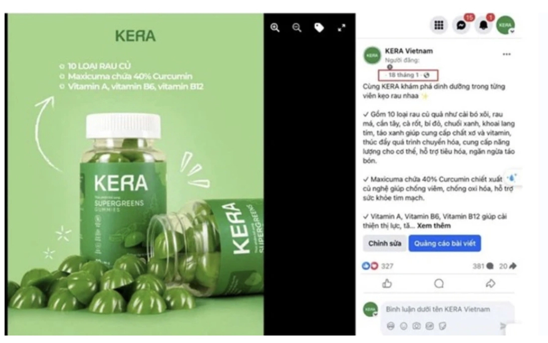 Cục An toàn thực phẩm nhận được thông tin trên một số website, facebook, Tiktok... đang quảng cáo sản phẩm Thực phẩm bổ sung SUPERGREENS GUMMIES với tên gọi là Kẹo rau củ Kera (do Công ty Cổ phần Tập đoàn Chị em rọt, địa chỉ: 144-146-148 Đường số 11, khu phố 5, Phường An Phú, Thành phố Thủ Đức, Thành phố Hồ Chí Minh công bố, sản xuất tại Công ty Cổ phần ASIA LIFE, địa chỉ số 18/99 Nguyễn Văn Linh, xã Ea Tu, thành phố Buôn Ma Thuột, tỉnh Đắk Lắk) có dấu hiệu vi phạm quy định về quảng cáo thực phẩm, gây bức xúc dư luận.