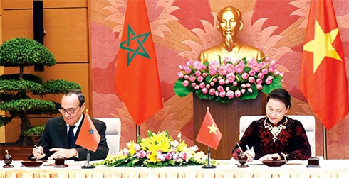 Chủ tịch Quốc hội Nguyễn Thị Kim Ngân và Chủ tịch Hạ viện Vương quốc Maroc Habib El Malki ký Thỏa thuận hợp tác song phương đầu tiên giữa Quốc hội Việt Nam và Hạ viện Maroc (ngày 18-12-2017)