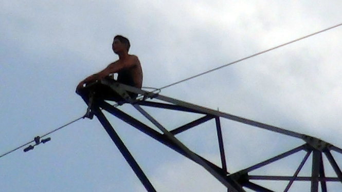 Sau đó, người dân phát hiện thanh niên này ngồi trên đỉnh cột điện cao thế cao khoảng 50 mét nên báo lực lượng chức năng.