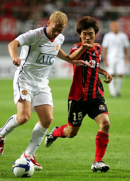 Khi còn khoác áo cầu thủ, ông Kim Han-yoon (phải) đã từng chạm trán với danh thủ Paul Scholes VIETNAM FOOTBALL