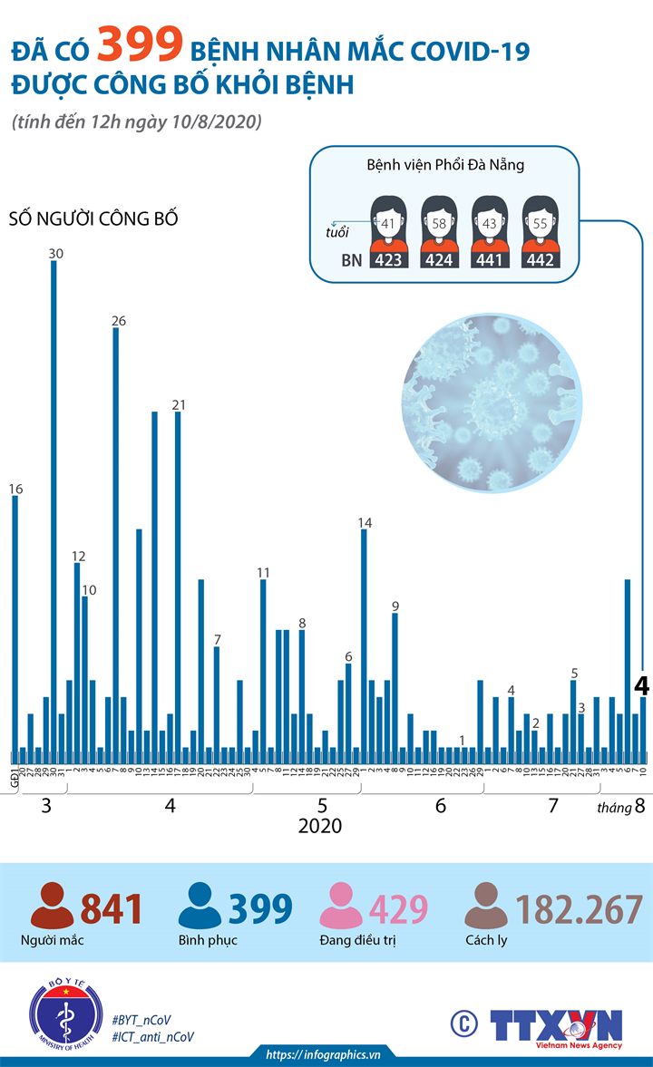 Tính đến 12h ngày 10/8/2020, đã có 399 bệnh nhân mắc COVID-19 được công bố khỏi bệnh. 4 bệnh nhân COVID-19 đầu tiên của tâm dịch Đà Nẵng được công bố khỏi bệnh là các bệnh nhân: BN423,BN424,BN441,BN442.