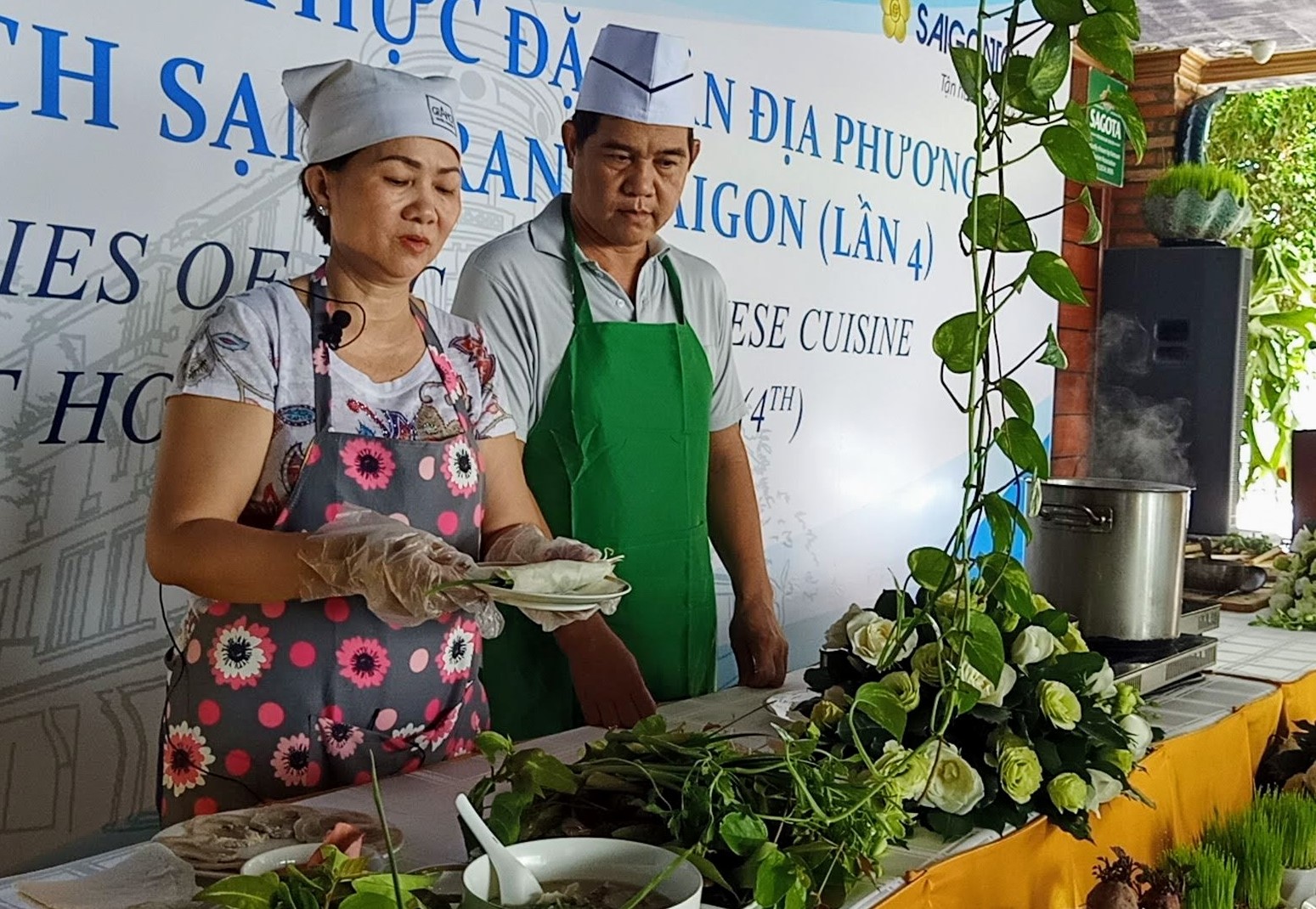 Đại diện hệ thống bánh canh Năm Dung biểu diễn cách thức thực hiện các đặc sản của Tây Ninh.